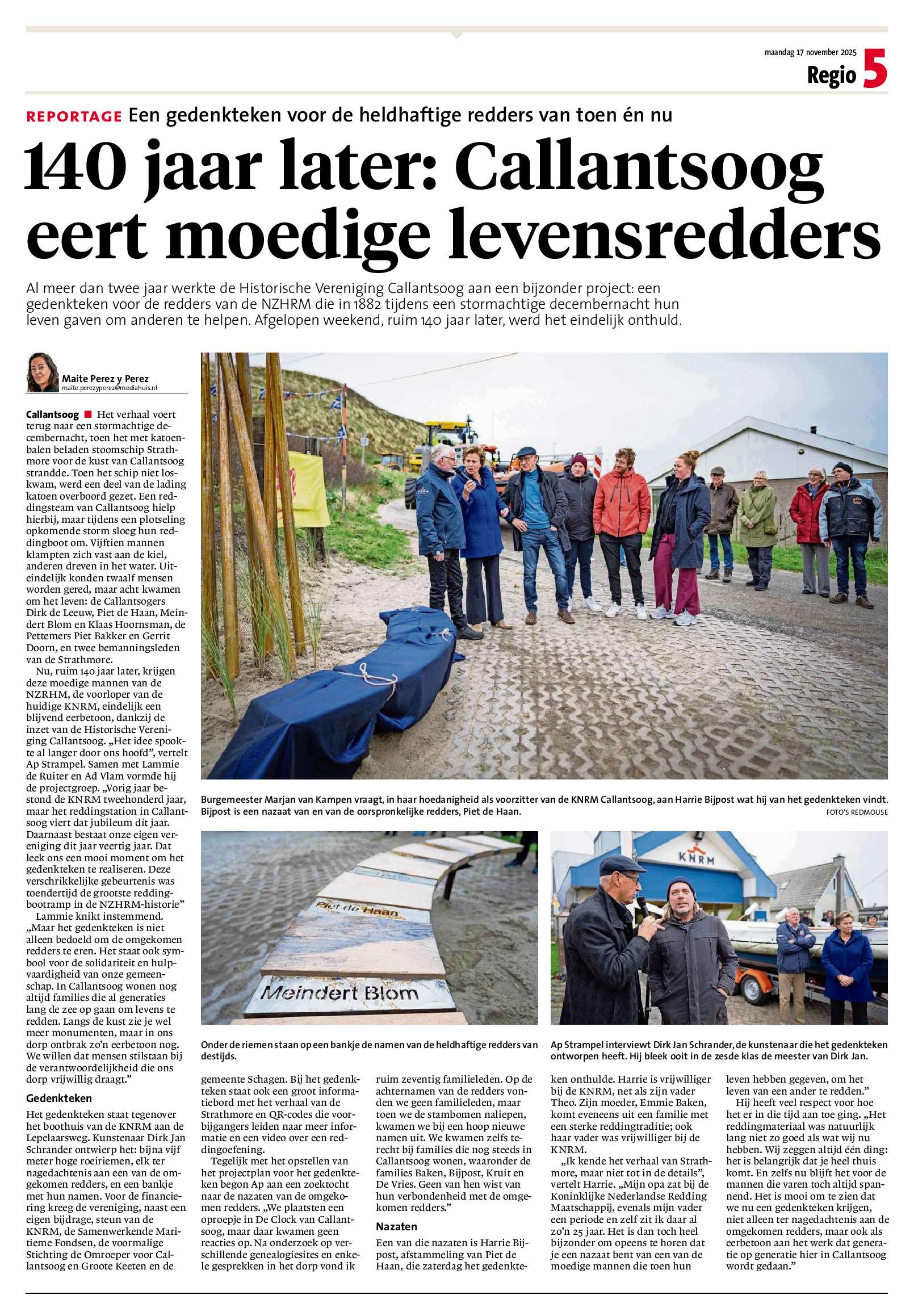 Zaterdag 15 november jl is de onthulling geweest van het gedenkteken voor de omgekomen redders van de Strathmore. Het was een fantastische middag samen met een kleine100 genodigden, waaronder 26 nabestaanden. Ook in het Noord-Hollands Dagblad is aandacht geweest voor de onthulling. |
